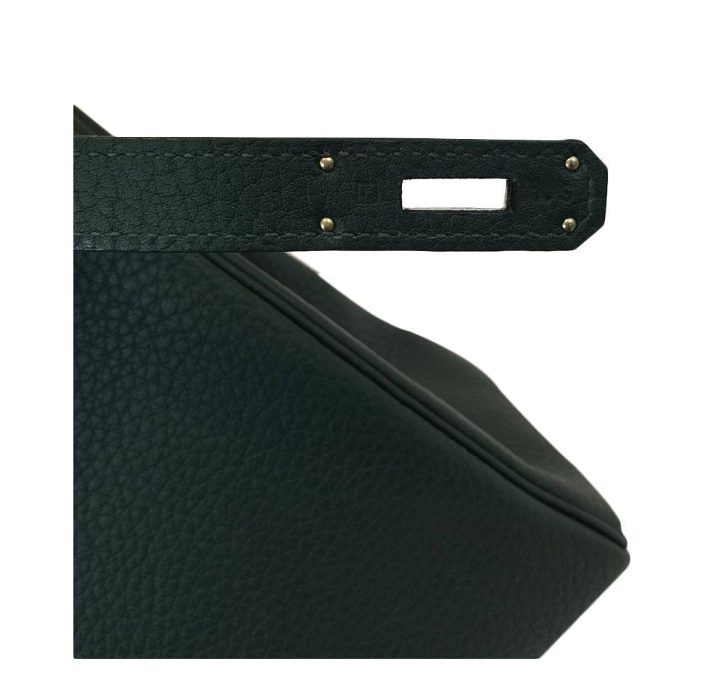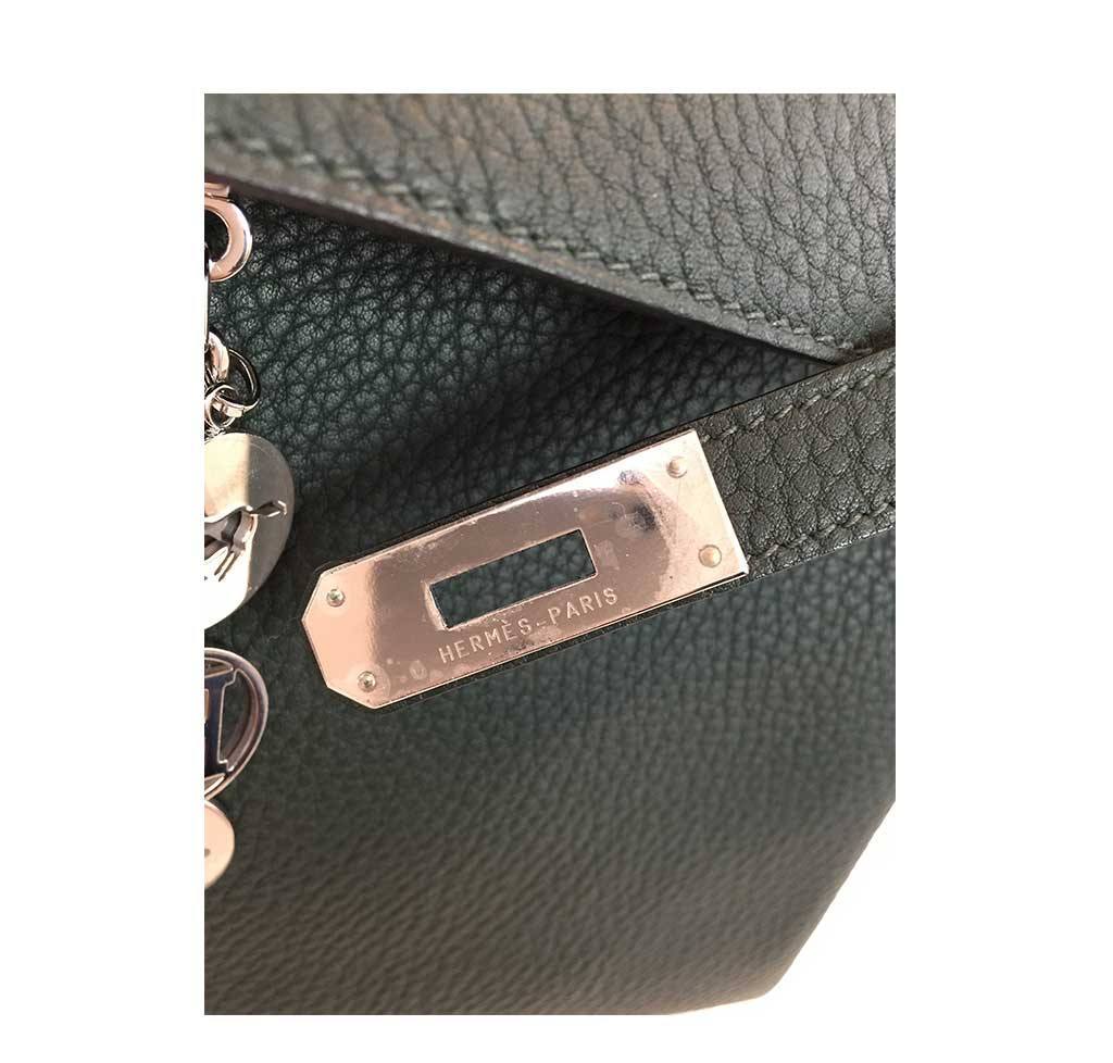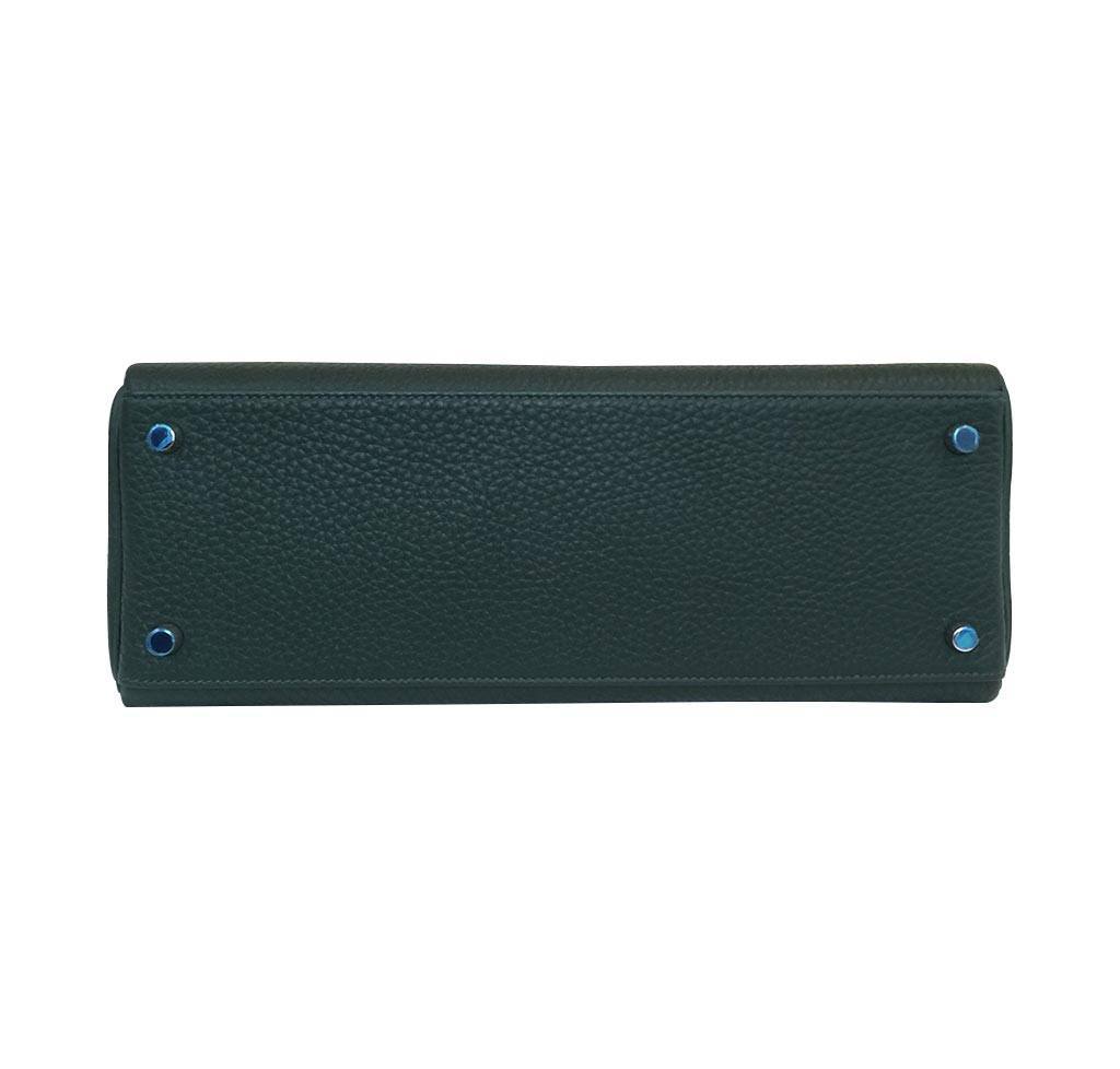 This Hermès Kelly 32cm bag is featured in the Vert Anglais color, which is a dark green tone. This bag is made from smooth Togo leather and is accentuated by palladium hardware. This New bag has never been carried and is still in the same condition as the day it left the Hermès boutique. All of the original accessories are included.