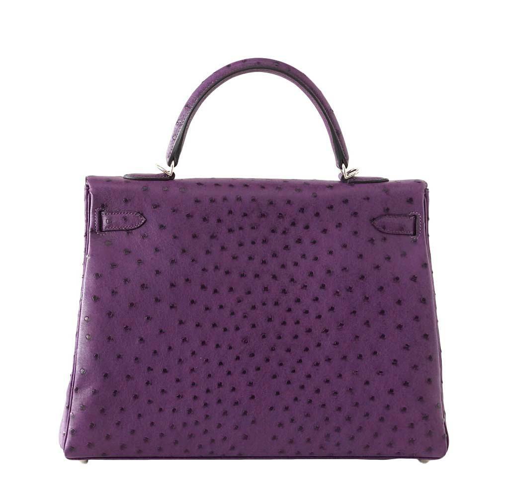 The rarity and beauty of this Hermès Kelly bag is undeniable. This work of art is featured in the purple-toned Violine color and is accentuated by rich palladium hardware. The exterior is made from exotic ostrich leather, which is easy to distinguish by the opulent pores found throughout the bag. This bag is store fresh, it was never carried and the hardware is still protected by the original plastic coverings. This sublime masterpiece by Hermès is a true collectorâs piece. Contact us for more details and availability.