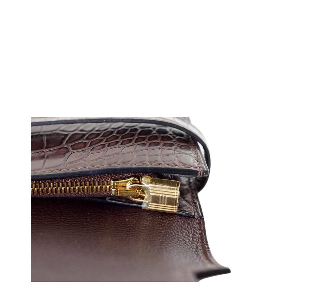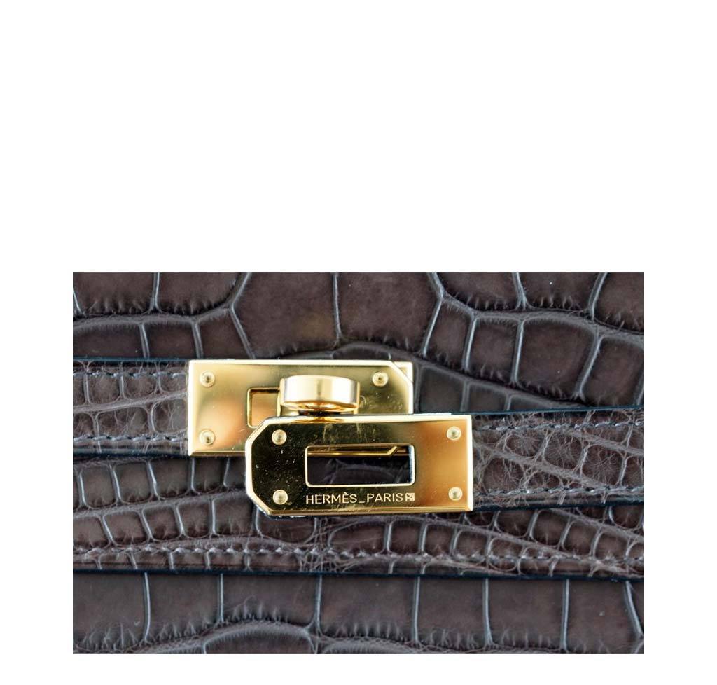 This extremely rare Hermès Kelly Long Wallet clutch is nearly impossible to find anywhere else. This bag is made from matte alligator skin, which is indicated by the square symbol under the “Hermès Paris” embossing. This Kelly Clutch is featured in the brown-toned Havane color and is accentuated by gold hardware.