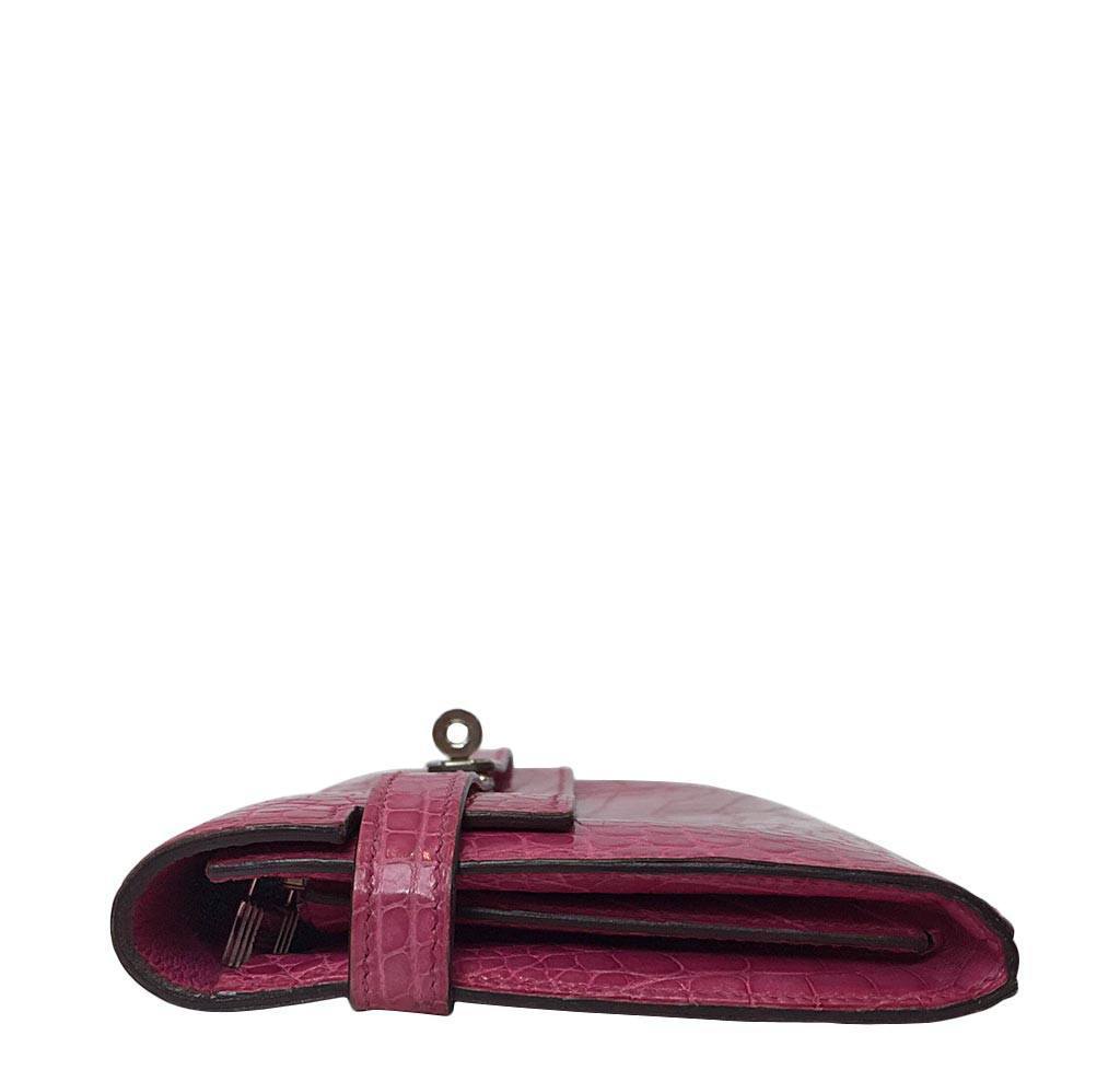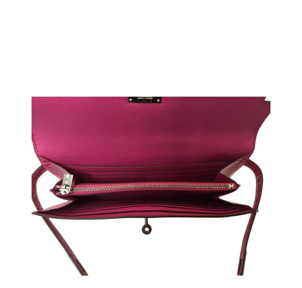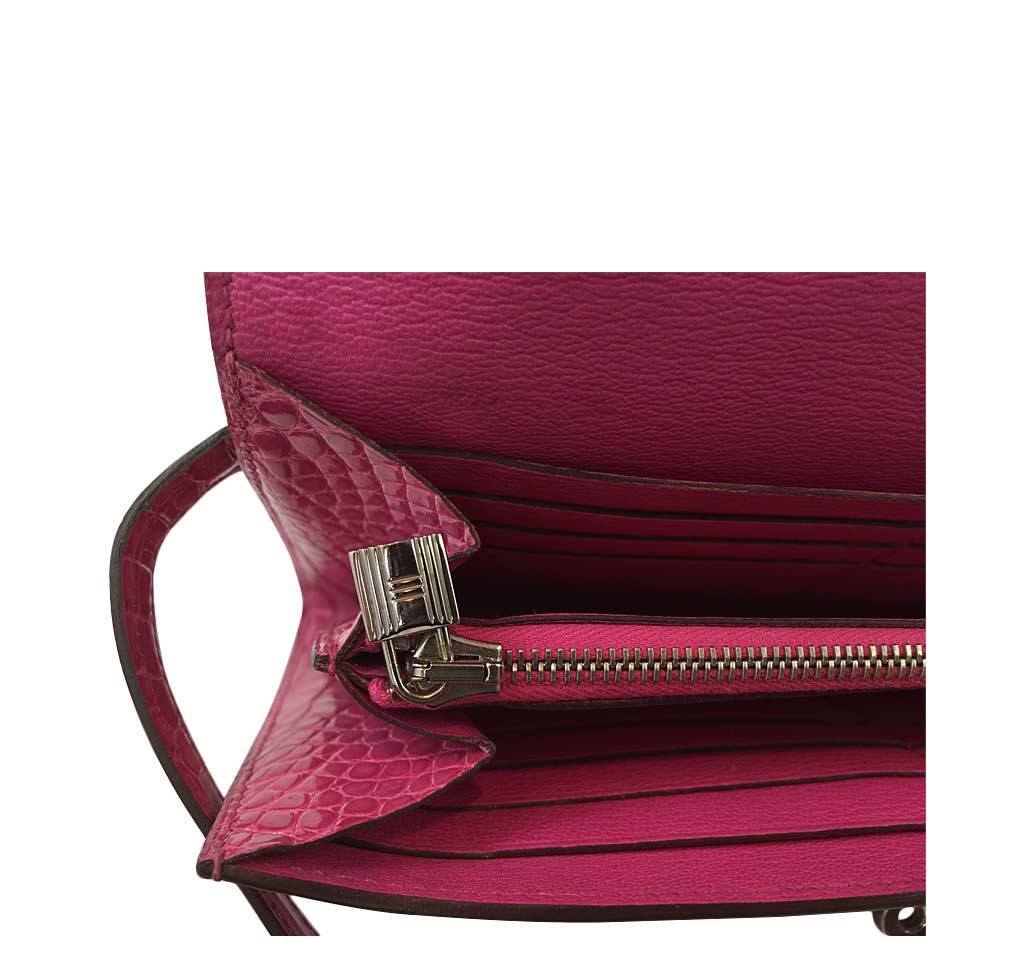 This extremely rare Hermès Kelly Long Wallet clutch bag is featured in Fuchsia, which is a bright and rich pink tone. This bag is made from exotic alligator skin, which is identified by the square signature next to the embossing. This Kelly Long Wallet bag is accentuated by palladium hardware. The blind stamp is “N” in a square, denoting 2010 as the year of production.