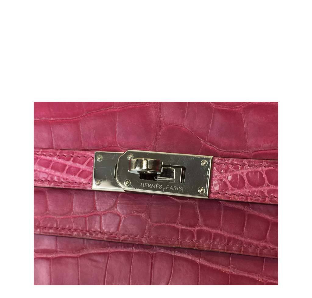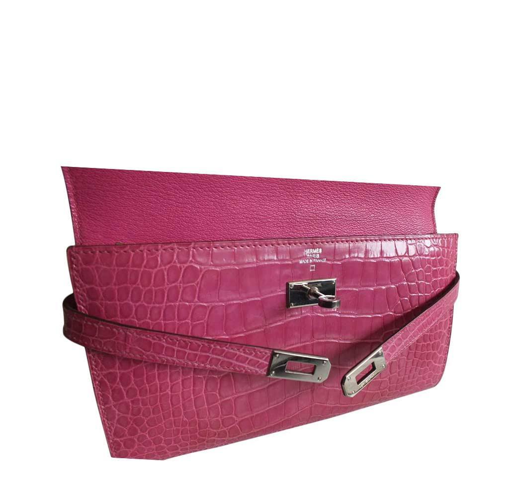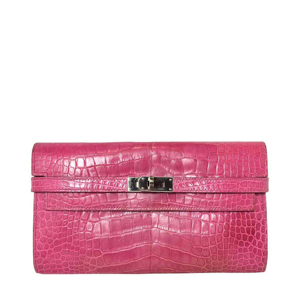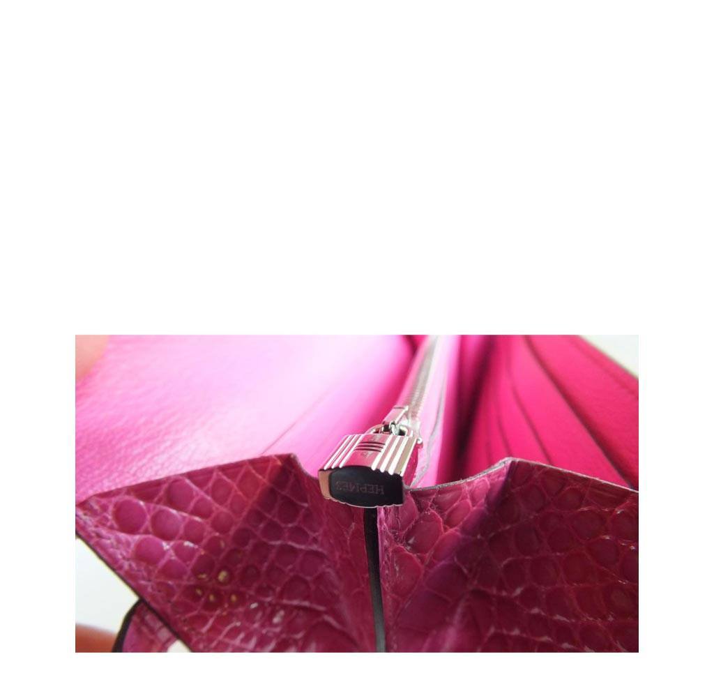 This extremely rare Hermès Kelly Long Wallet clutch bag is featured in Fuchsia, which is a bright and rich pink tone. This bag is made from exotic alligator skin, which is identified by the square signature next to the embossing. This Kelly Long Wallet bag is accentuated by palladium hardware. The blind stamp is “N” in a square, denoting 2010 as the year of production.