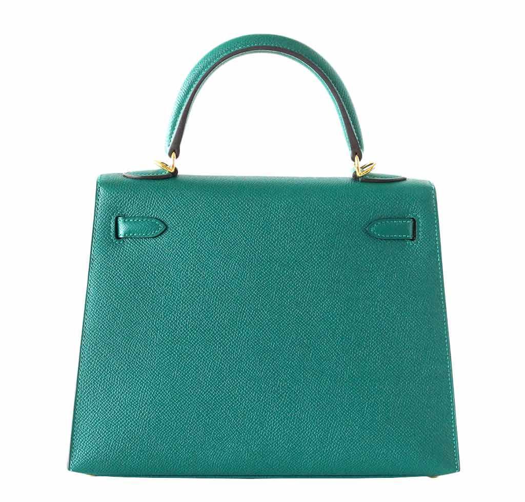 This exquisite Hermès Kelly Sellier 28cm bag is made from smooth Epsom leather. Kelly Sellier bags are famous for their sharper edges and outside stitching. This bag is accentuated by gold hardware and is featured in Malachite, which is a green tone. This store-fresh Kelly bag has never been carried and comes with all of the original accessories.