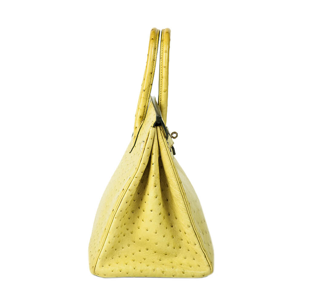 This Hermès Birkin 35cm bag is extremely rare because Hermes no longer makes Birkin 35cm bags in ostrich leather. This bag is featured in Vert Anis, which is a very bright green tone. The blind stamp is “F” in a square, which denotes 2002 as the year of production and this bag is accentuated by palladium hardware.