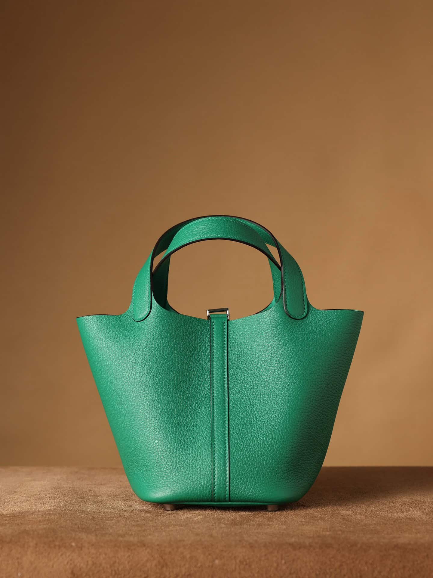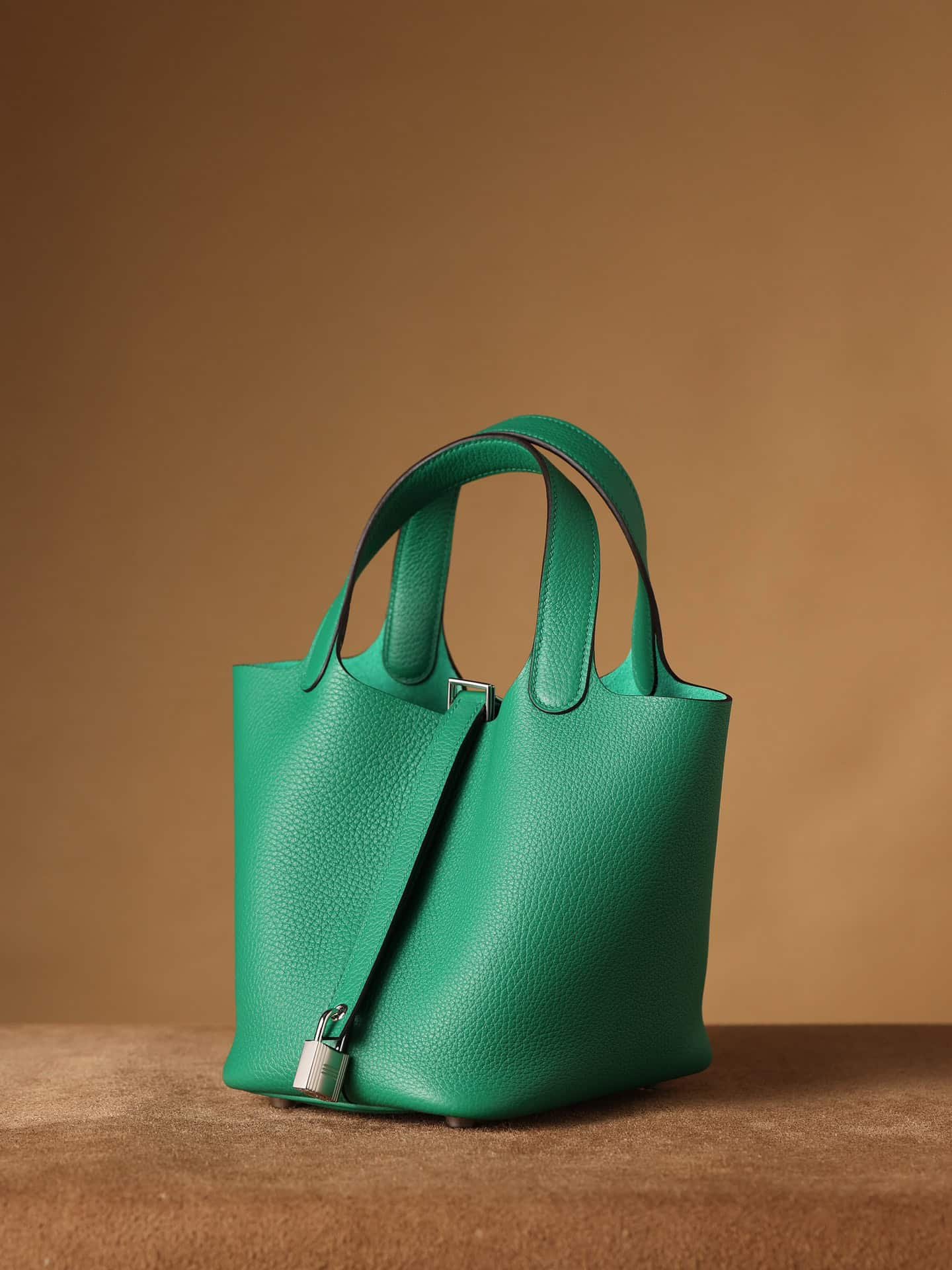 Unlined and with clean edges, the Picotin green bag has a naturally understated appearance. Ever so supple, it proudly displays its material, enhanced by a central seam. A source of many emotions, its simplicity inspires.
