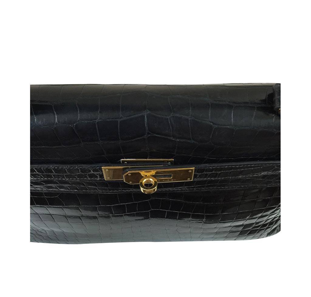 This vintage Hermès Kelly 32cm bag is made from shiny porosus crocodile skin, which is identified by the circumflex symbol (^) in the embossing. The blind stamp is “Q” in a circle, which denotes 1987 as the year of production. This bag is featured in black and is accentuated by gold hardware. Contact us for additional details and availability.