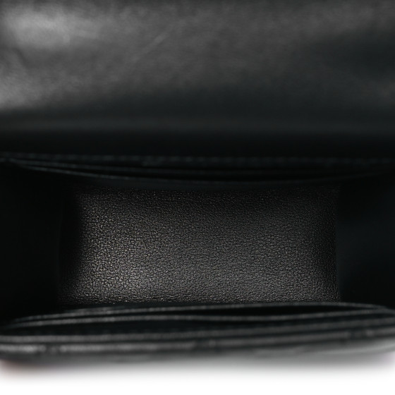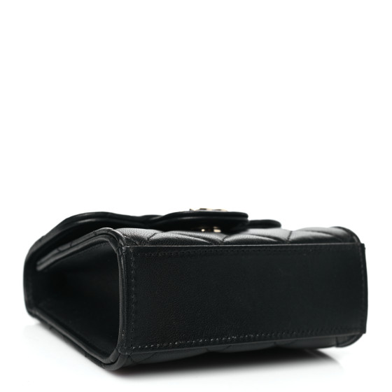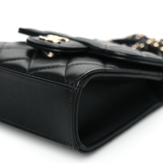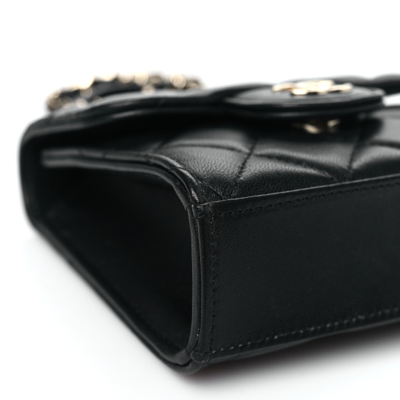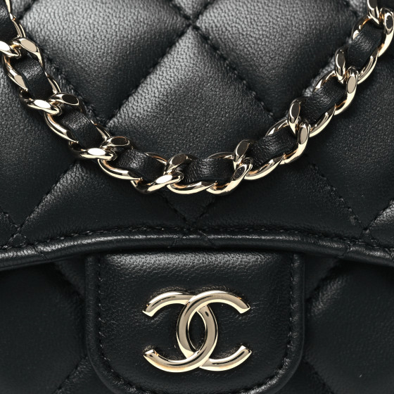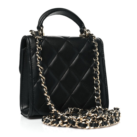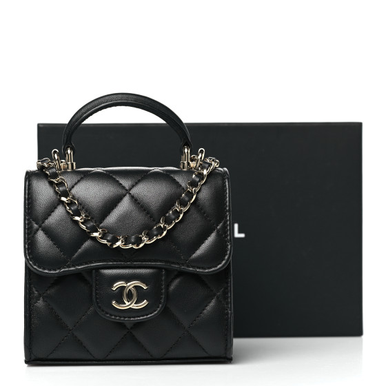 This is an authentic CHANEL Lambskin Quilted Top Handle Flap Clutch With Chain in Black. This stylish bag is crafted of luxuriously soft diamond quilted calfskin leather in black. The bag features a gold chain leather threaded shoulder strap, a leather top handle, and a facing flap with a small gold Chanel CC logo. The flap opens to a black leather interior with a mirror in the flap and card slots.
