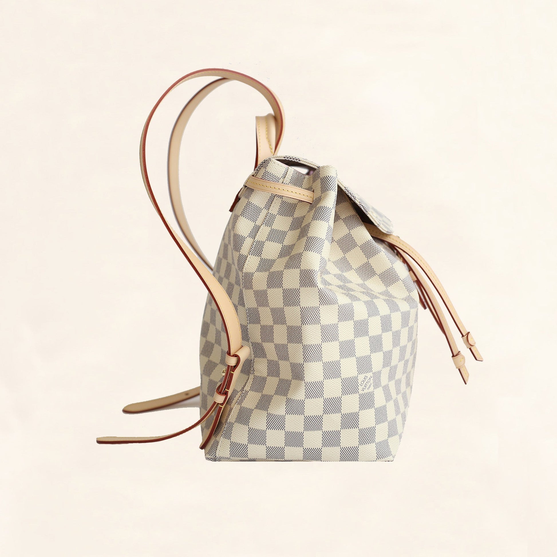 Characteristics: The compact and casual chic Sperone backpack has all the sophisticated details and flawless functionalities to make it your new favorite backpack. This refined backpack is crafted of damier checkered canvas in blue and white. The backpack features vachetta shoulder straps, top handle and cinch cord . The bag also features brass hardware, an exterior zip pocket and a corssover flap with a belt closure. The top opens to a light pink ballerine fabric interior with a slit pocket and a D ring.
