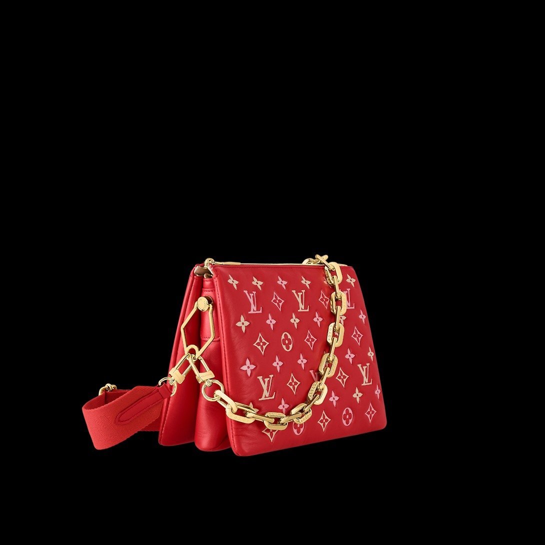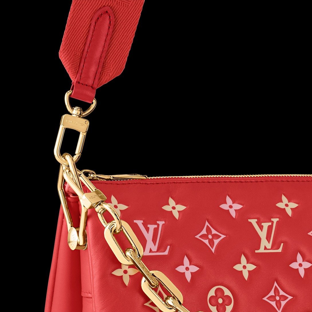 For Spring 2023 the Coussin PM handbag is arrayed in a luminous seasonal colorway. Fashioned from pillowy lambskin embossed with Monogram motifs, this edition will enliven any warm-weather silhouette. The bagââ¬â¢s chunky golden chain is perfect for an over-the-shoulder carry, while the wide textile strap can be styled for cross-body wear.