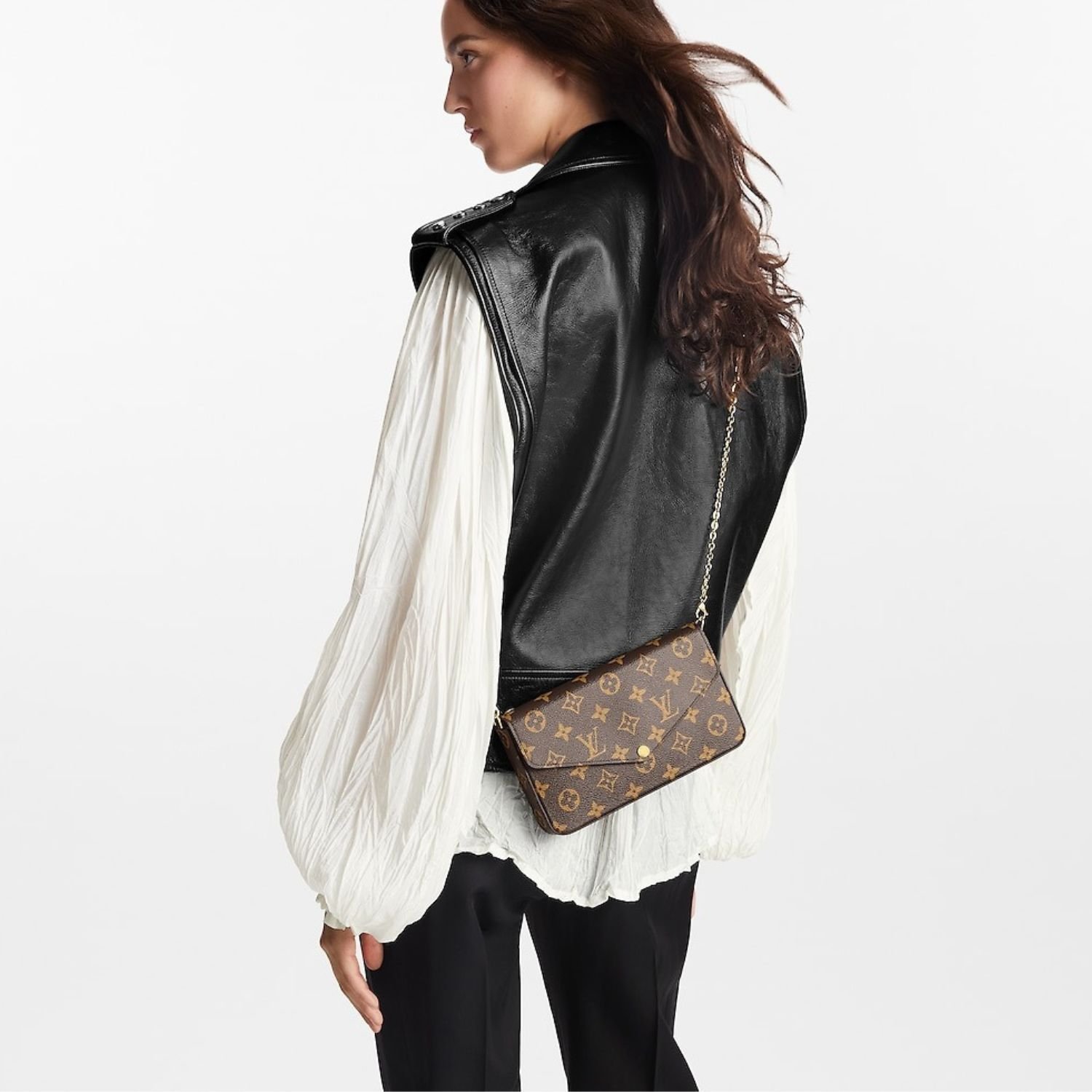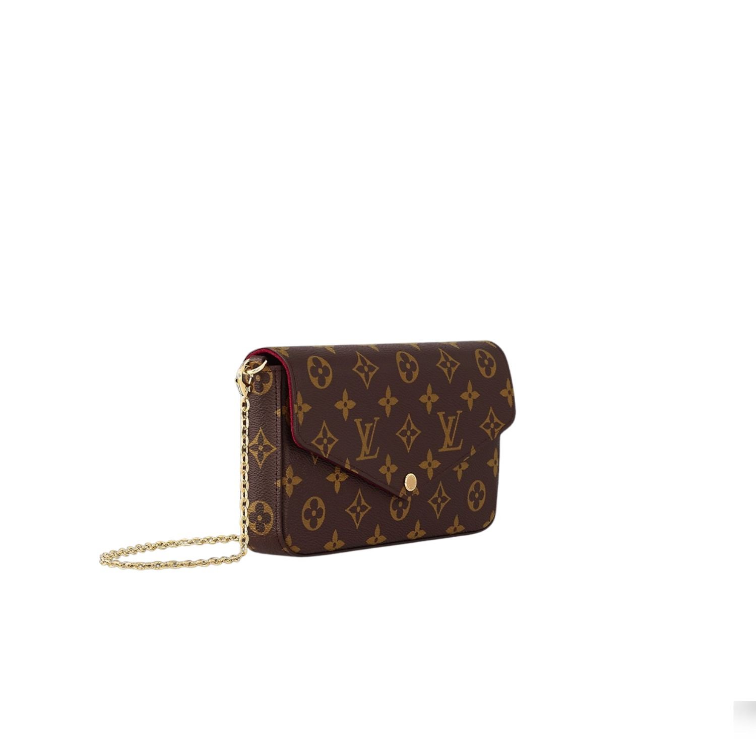 The versatile F?licie Pochette flap pouch is fashioned from Monogram canvas and lined in fuchsia microfiber. Inside there are two removable pockets: a zipped pocket and a flat pocket with eight card slots. The removable gold-color metallic chain enables shoulder and cross-body carry. The F?licie closes with a press-stud.