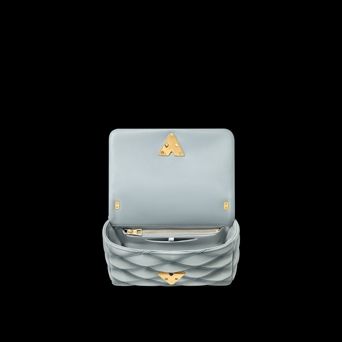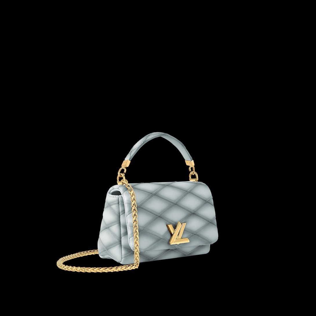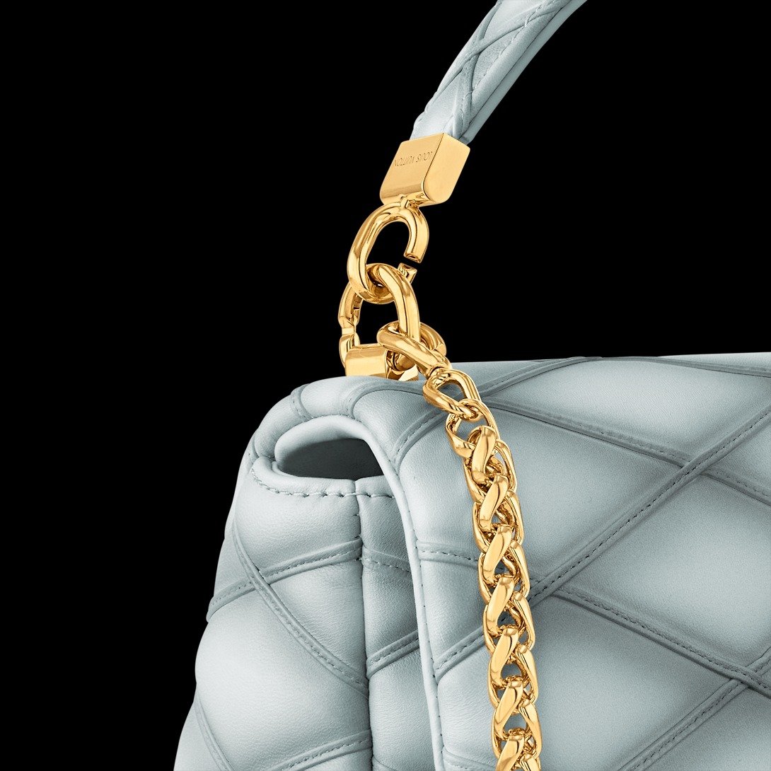 Nicolas Ghesquiere explores new techniques to embellish the GO-14 MM handbag. The top handle and adjustable chain both detachable enable carry options. It’s signed with the House’s emblematic LV Twist lock.