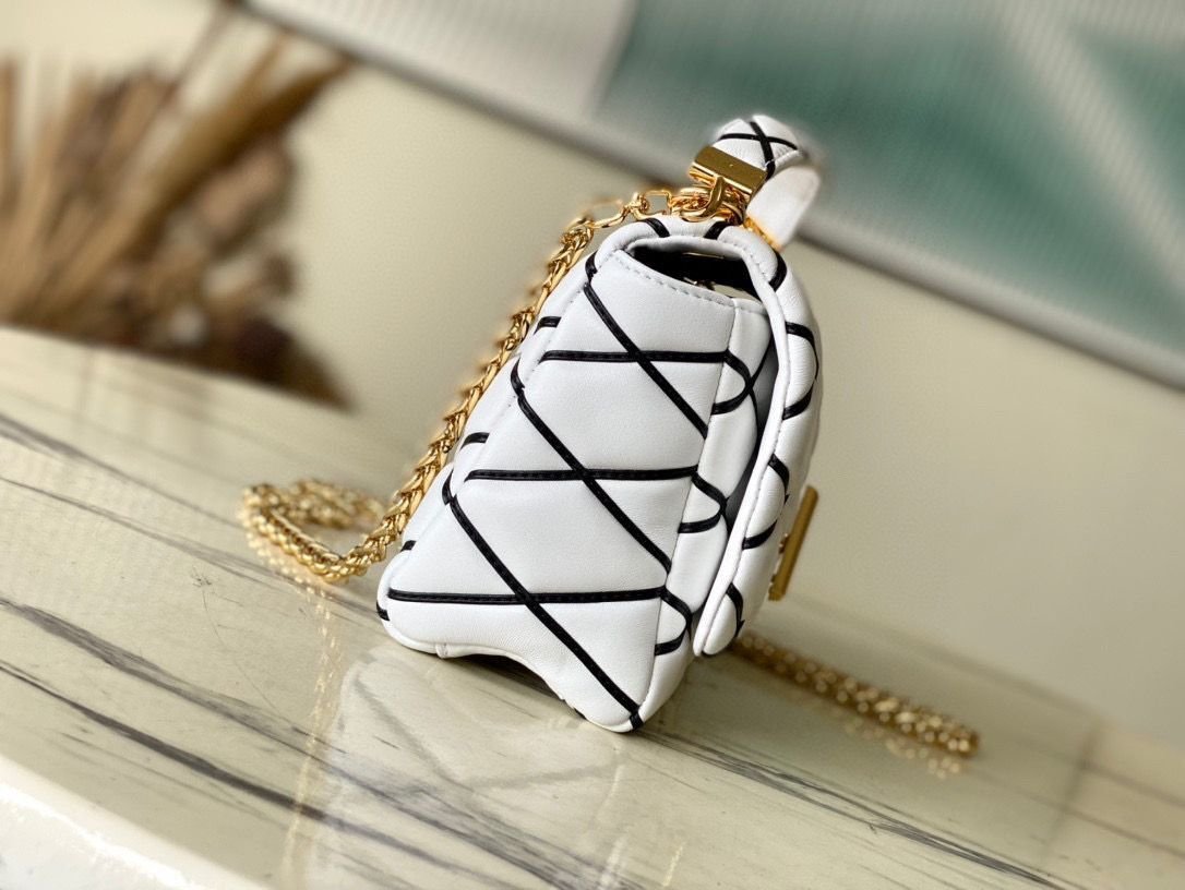 The GO-14 MM bag features the signature quilted pattern designed for the Maison’s historic trunks. Accented with a gleaming golden LV Twist lock, this versatile model can be carried by the top handle or worn on its sliding chain. Alternately, the top handle can also be converted into a leather pad on the chain for a comfortable shoulder or crossbody carry.