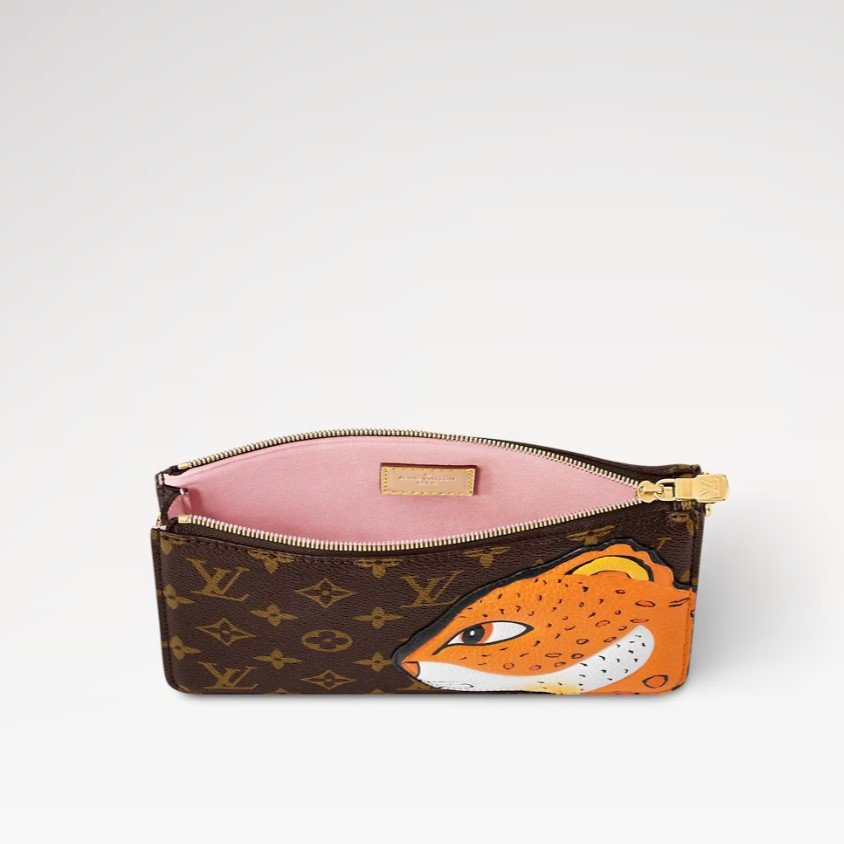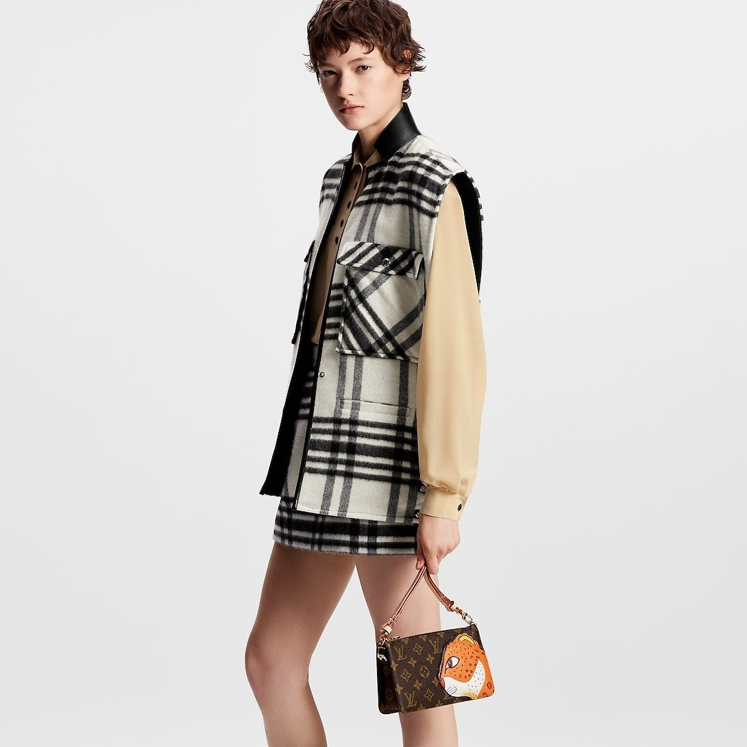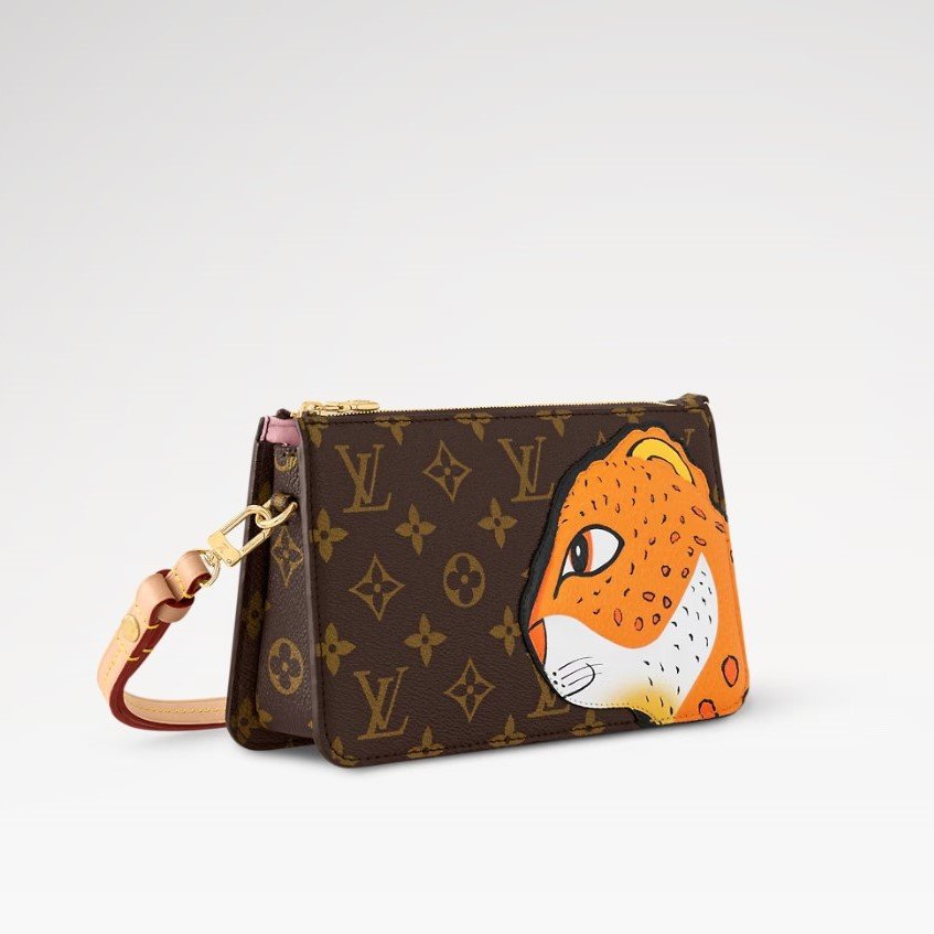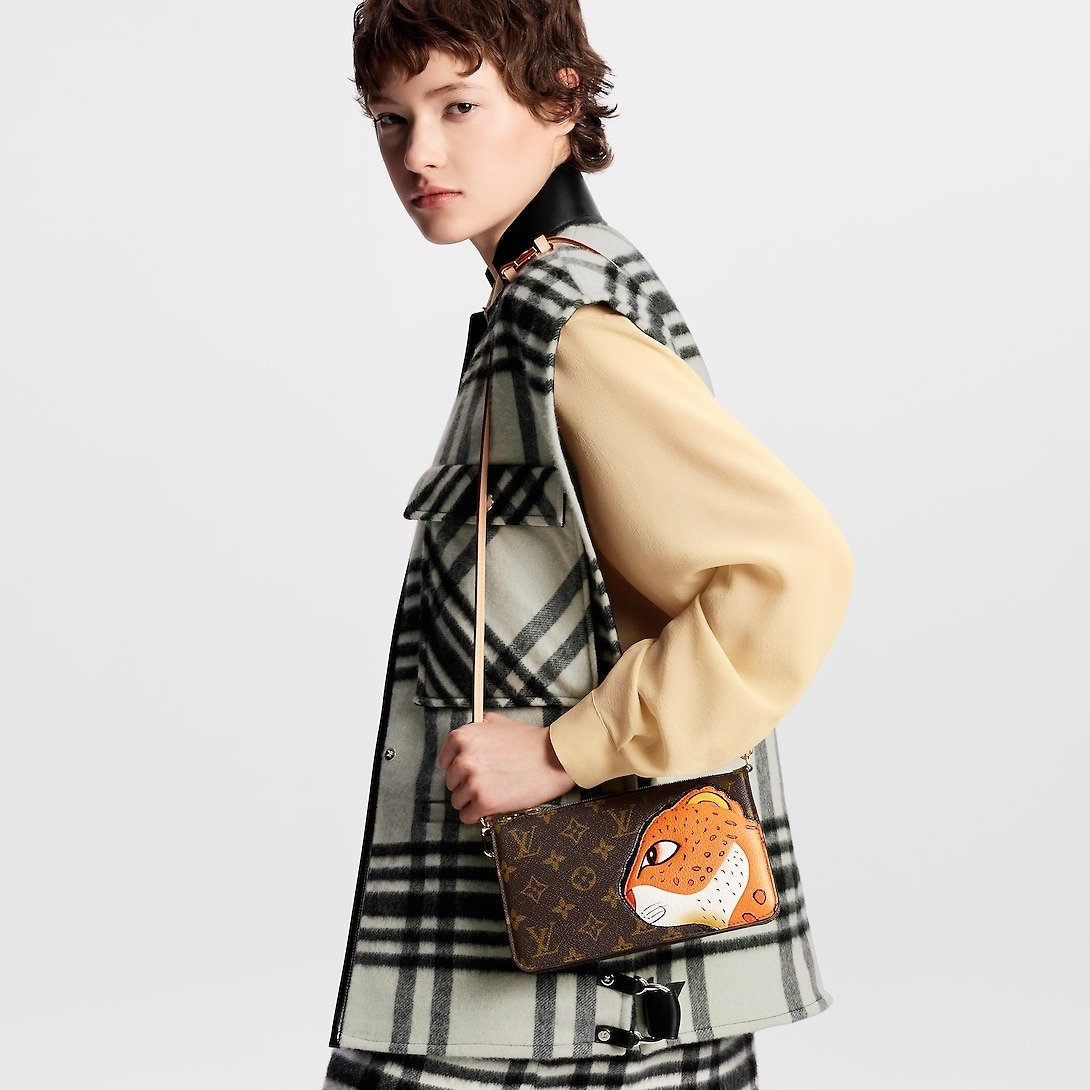 - The Lexington pouch in Monogram canvas is revisited for an exclusive collaboration between the artist Sun Yitian and Louis Vuitton Artistic Director Nicolas Ghesqui?re. This collectible piece features a grained calfskin patch of a leopard, inspired by Sun Yitian’s colorful paintings of mass-produced toys. It brings a playful twist to this chic mini-bag, which comes with an orange lining, relying on the background of the original artwork, and a removable strap in natural leather.