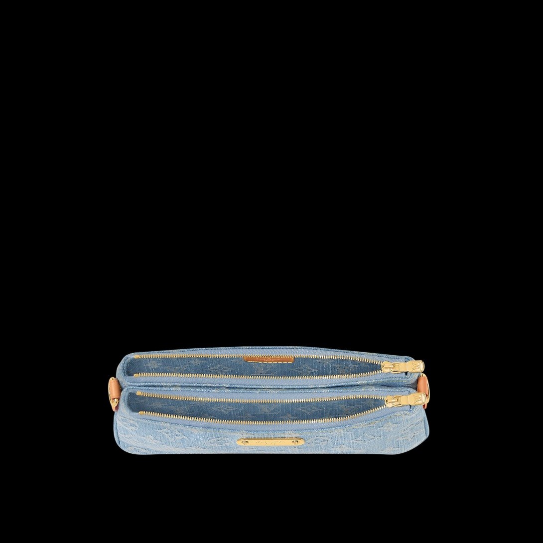 The Liv pochette wth Monogram denim pattern for a vintage look and a summery feel. Designed to sit snugly under the arm, this small bag comes with a removable chain in gold-tone metal and a removable, adjustable strap in aged natural leather. It is signed with a Louis Vuitton-engraved plaque.