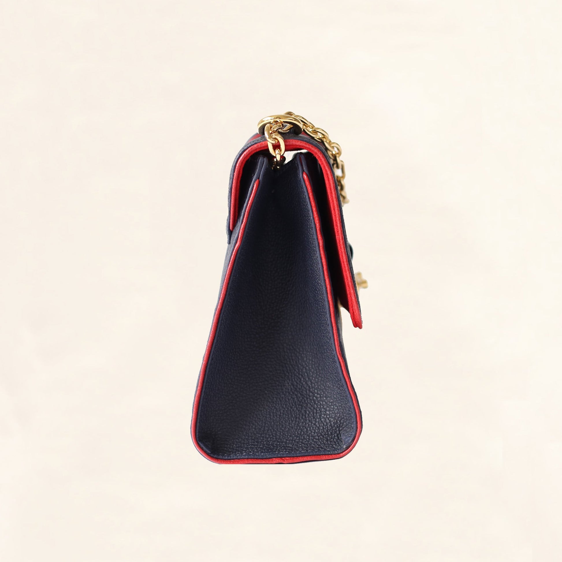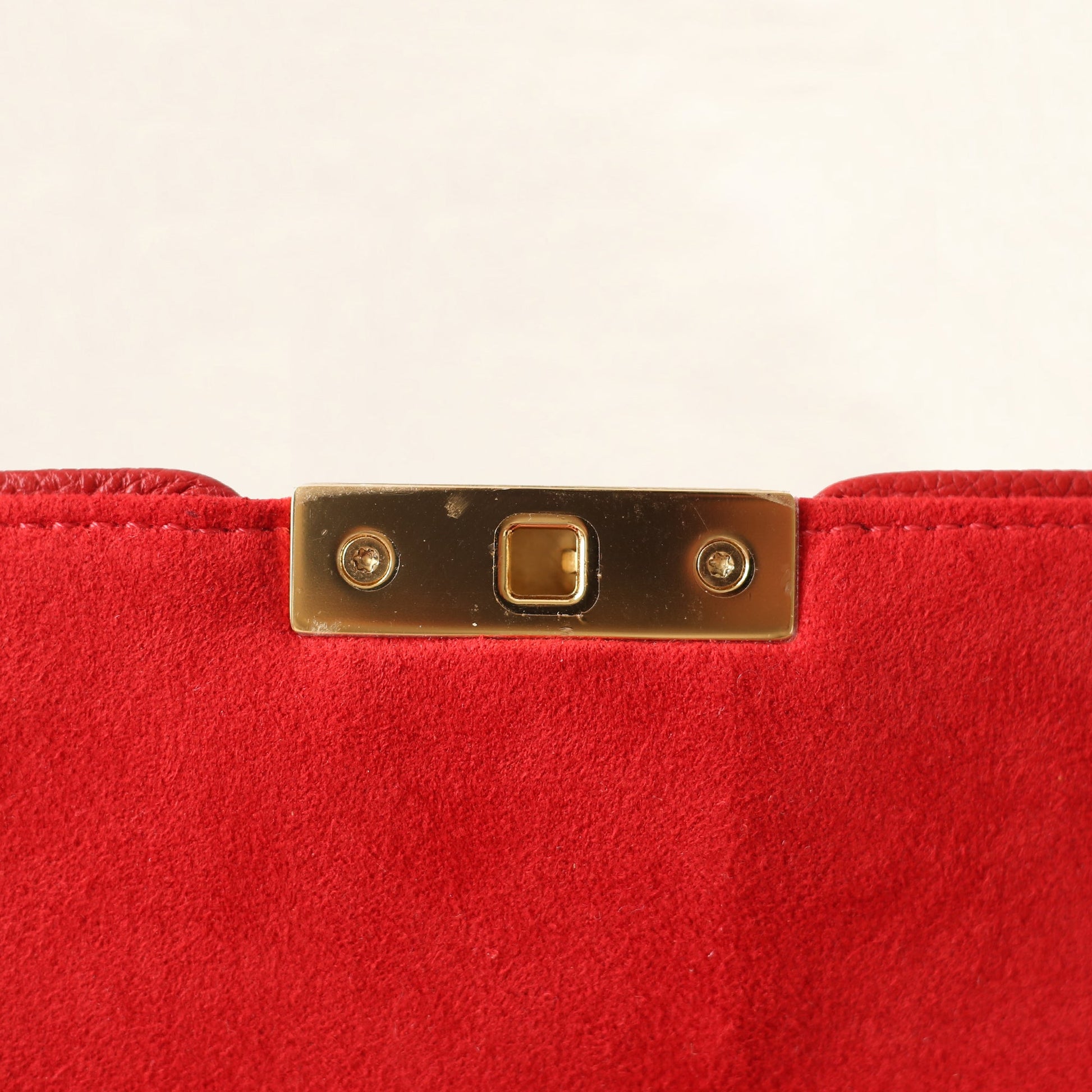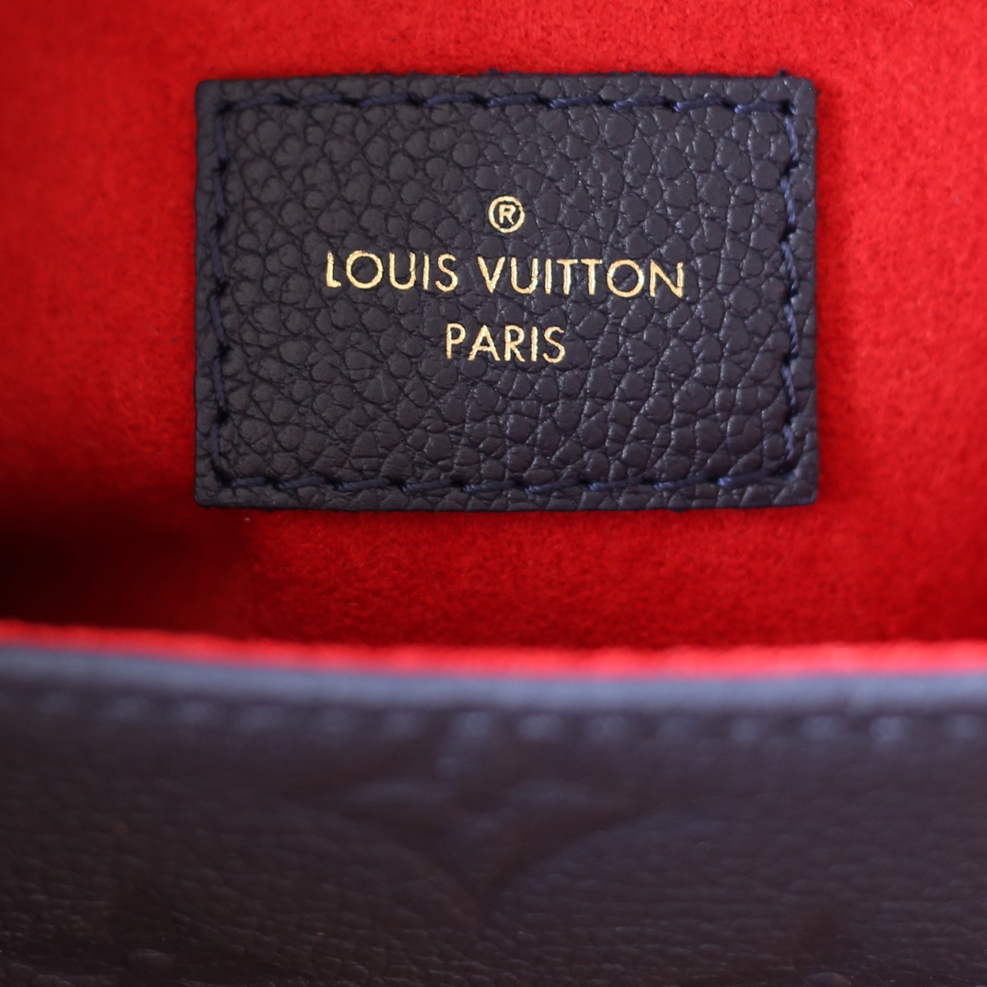 Characteristics: With its casual-chic design, the new St Sulpice in Monogram Empreinte leather is a sophisticated choice for day-to-evening. New, too, are the bagâs sliding chain and signature metal lock. Surprisingly roomy, it can be worn on the shoulder or cross-body. It is made of embossed supple cowhide leather with smooth cowhide leather trims. It opens to an inside compartment made of microfiber red lining, and has an inside flat pocket for organization. It is embellished with gold-color metal hardware.