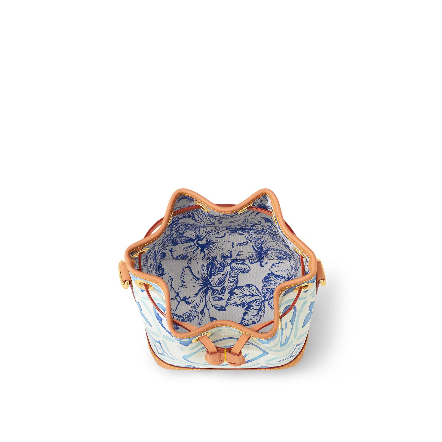 • The Nano Noe bag is revisited with a Mediterranean-style Monogram Tiles print on coated canvas as part of the LV By the Pool collection, which evokes travel to sunny destinations. Notably on the removable top handle and removable, adjustable shoulder strap, which offer different carry options.