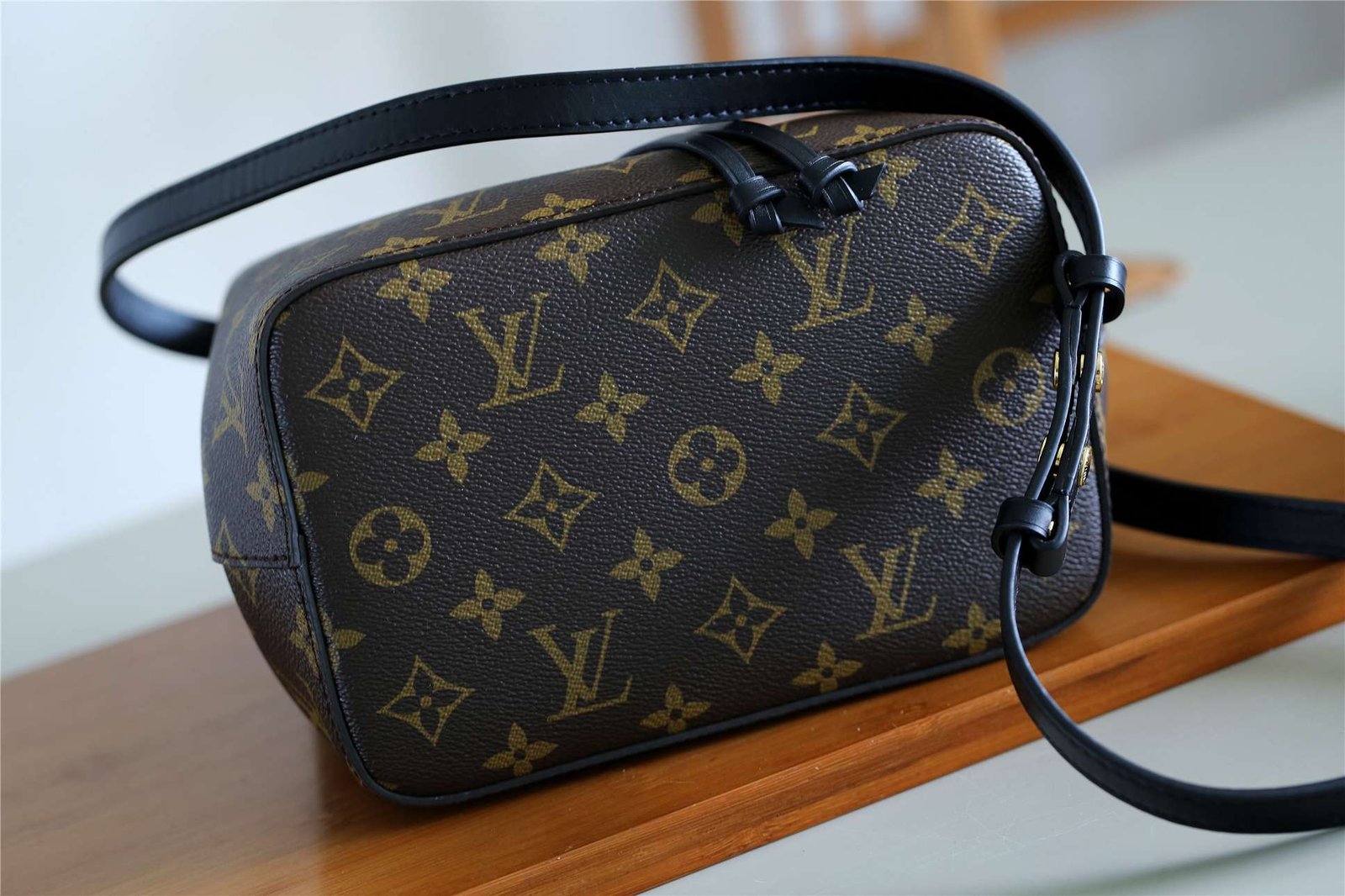 • A true House icon, the N?oNo? bucket bag revisits a 1932 design by Gaston-Louis Vuitton. The original was created to transport bottles of Champagne in style; this modern version in Monogram canvas features a sleek shape, colorful trim and a matching bonded lining. The adjustable smart strap can be slung over the shoulder or lengthened for a trendy cross-body carry.
