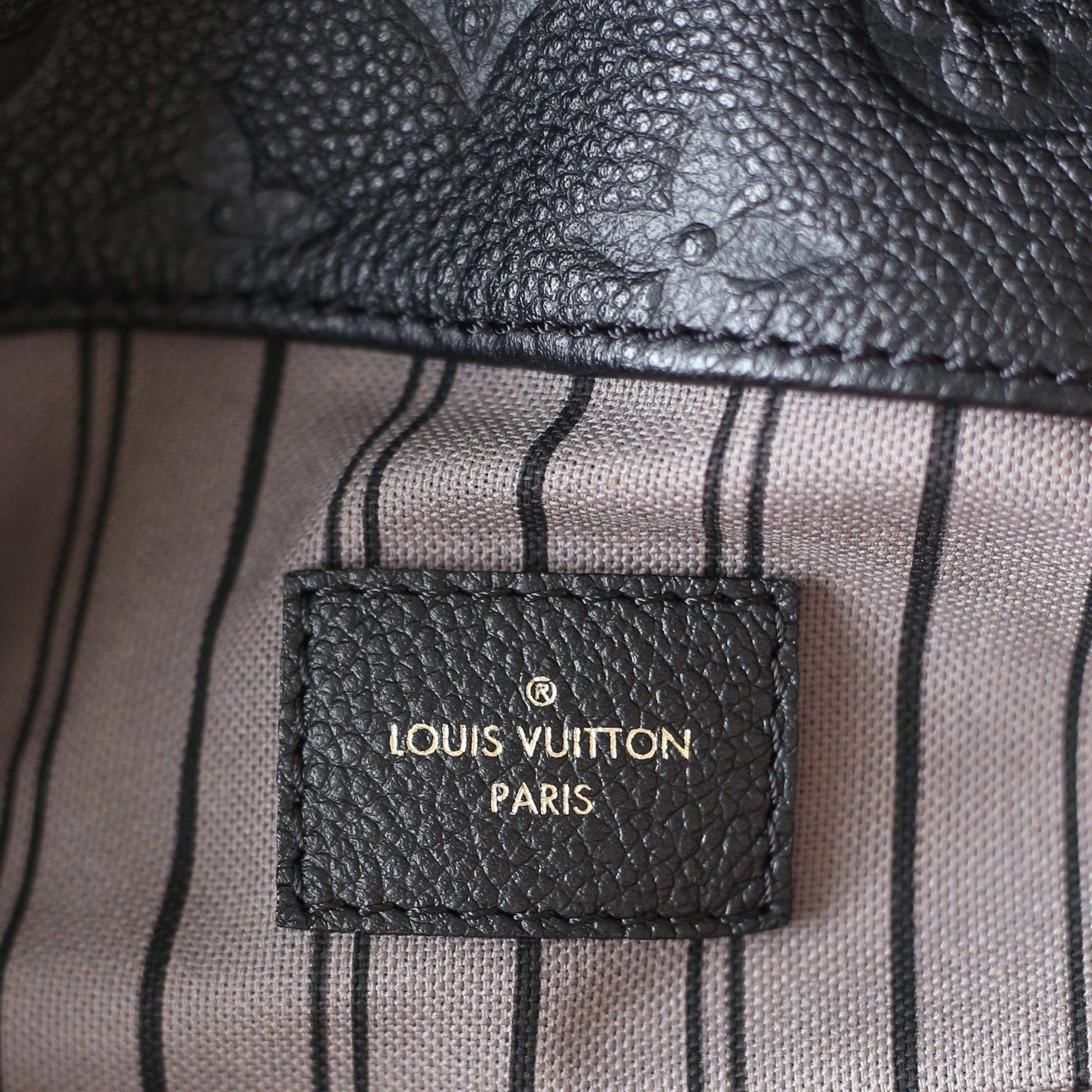 Characteristics: This stunning hobo style shoulder bag is crafted of monogram empreinte black leather. This shoulder bag features a looping leather shoulder strap with a woven braided detail and polished brass hardware. The top opens to a gray striped fabric interior with zipper and patch pockets.
