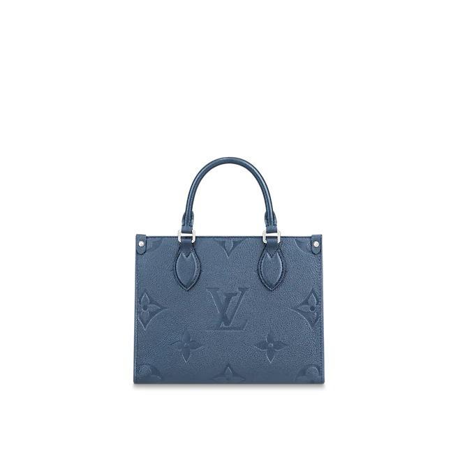 The compact OnTheGo PM tote is made from shimmering and festive navy-blue Monogram Empreinte leather, embossed with an oversized Monogram pattern. This smaller version of the original OnTheGo holds essential items such as an iPad Mini, phones and wallet. It can be hard-carried with its Toron handles or worn on the shoulder or as a crossbody thanks its adjustable, removable strap.