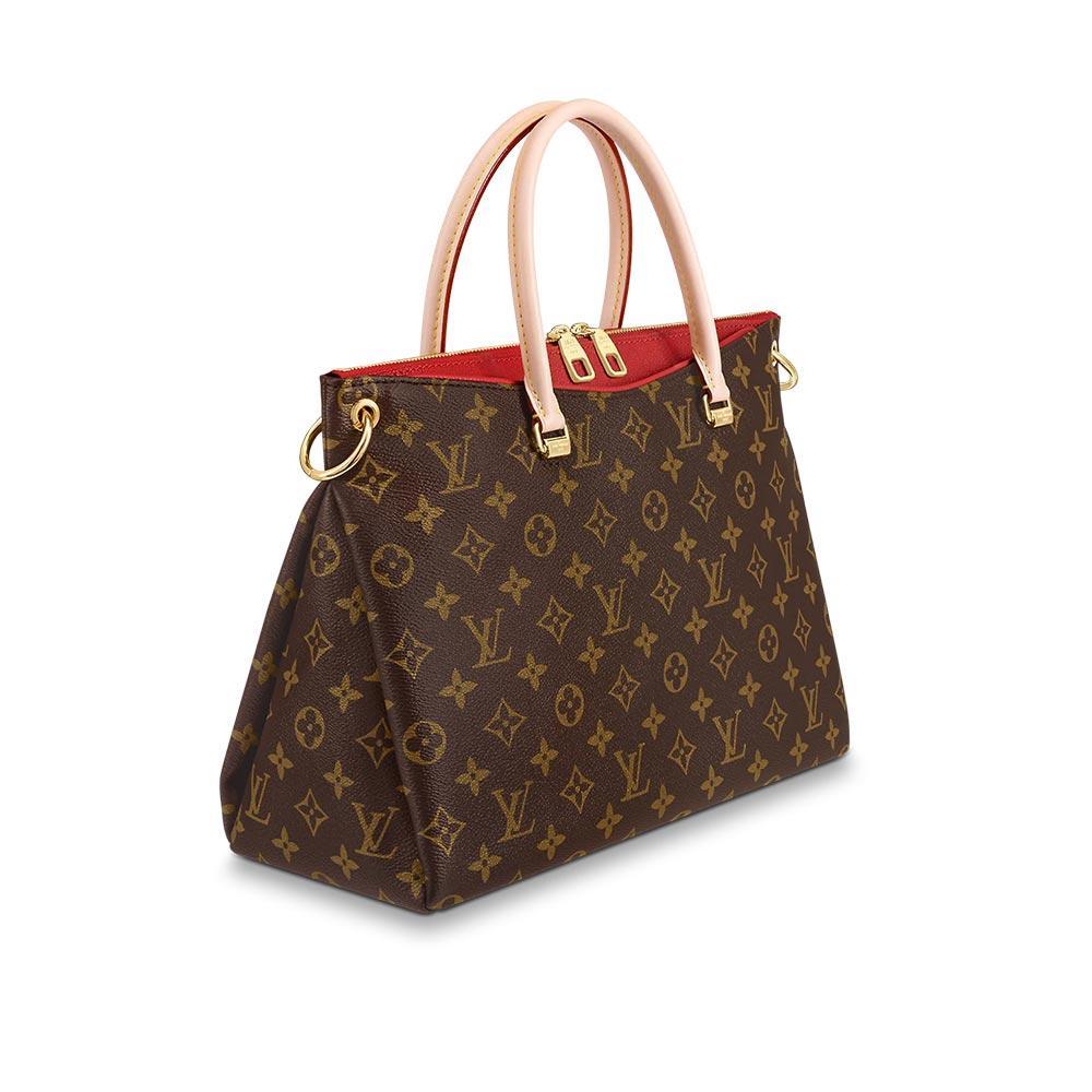 An elegant bag with timeless appeal, the Pallas MM combines the Houseâs iconic Monogram canvas with calfskin and natural cowhide trim. The coloured leather forms a V shape at the front of the bag, for a strong yet subtle signature. Ideally sized to hold essentials, it can be carried by hand or worn over the shoulder on its detachable strap.