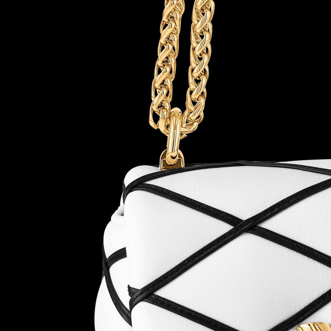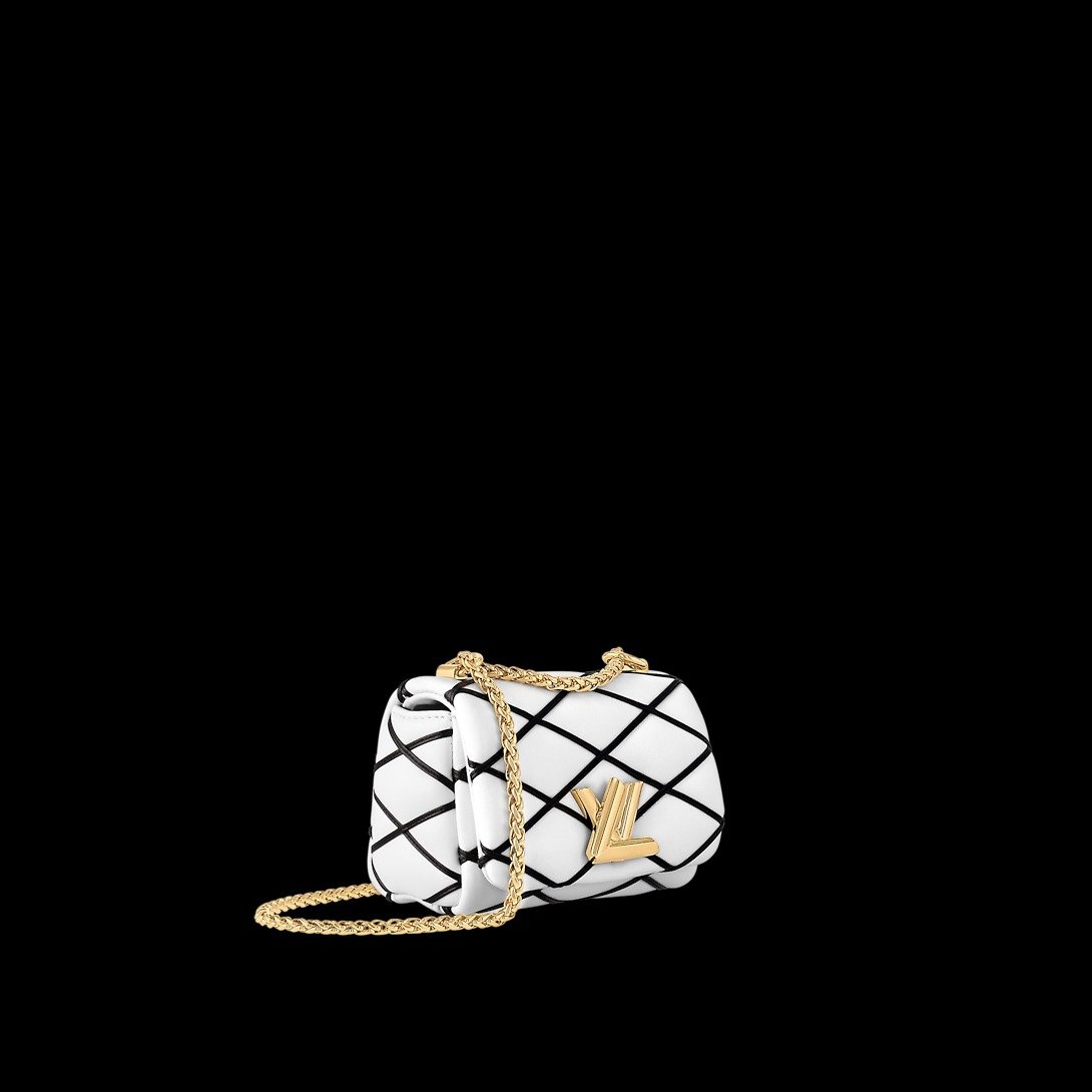 The bold black-and-white colorway is paired with gold-color hardware, including the LV Twist lock on the flap. A golden sliding chain adjusts for shoulder or cross-body wear.