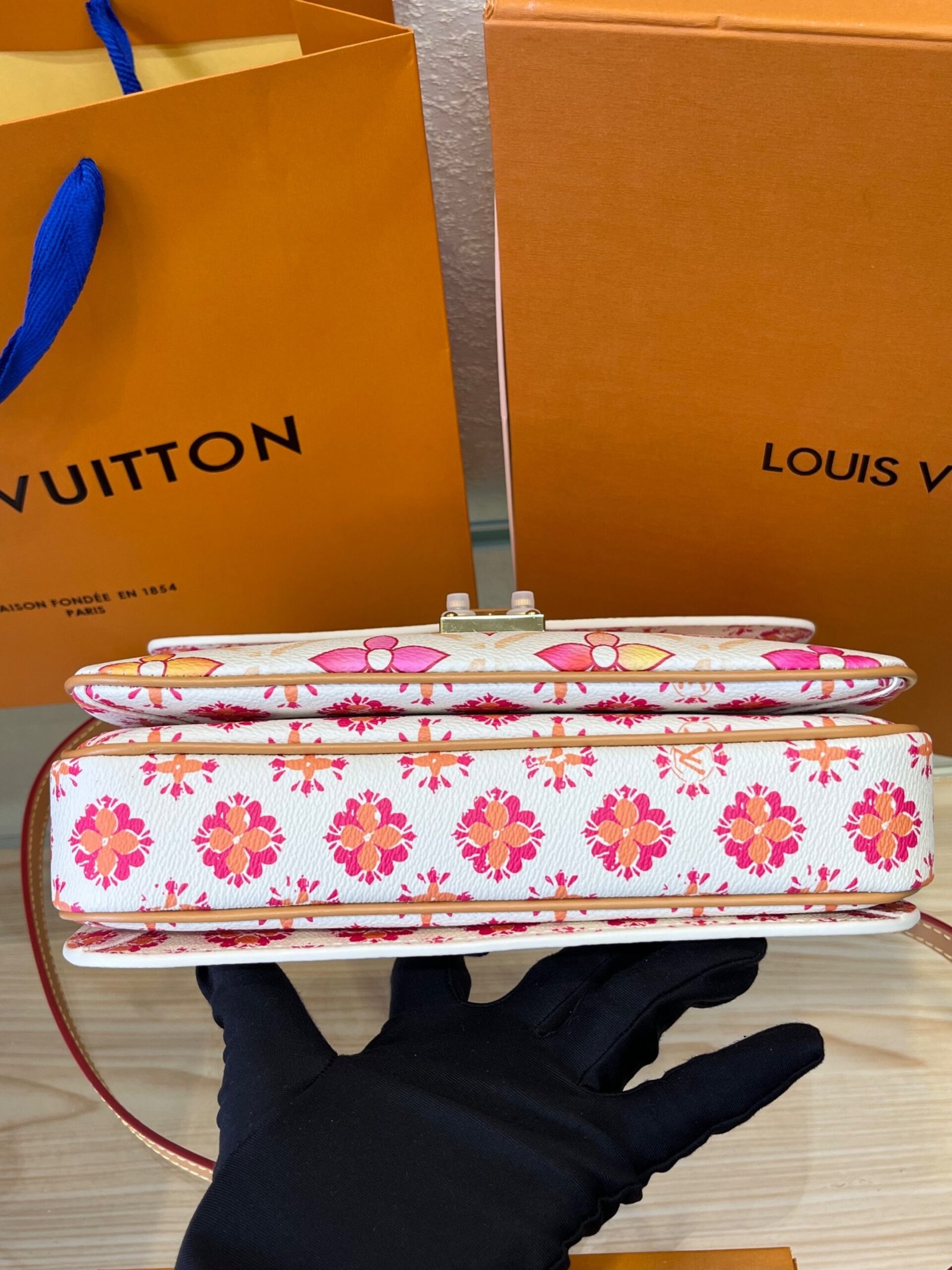 • The Pochette Metis handbag is made from Monogram Tiles canvas, with its vibrant colorway and intricate mix of shades, and features the LV Circle just above the S-lock closure. This satchel-style bag is fitted with an elegant top handle and a long removable strap for shoulder or cross-body wear.
