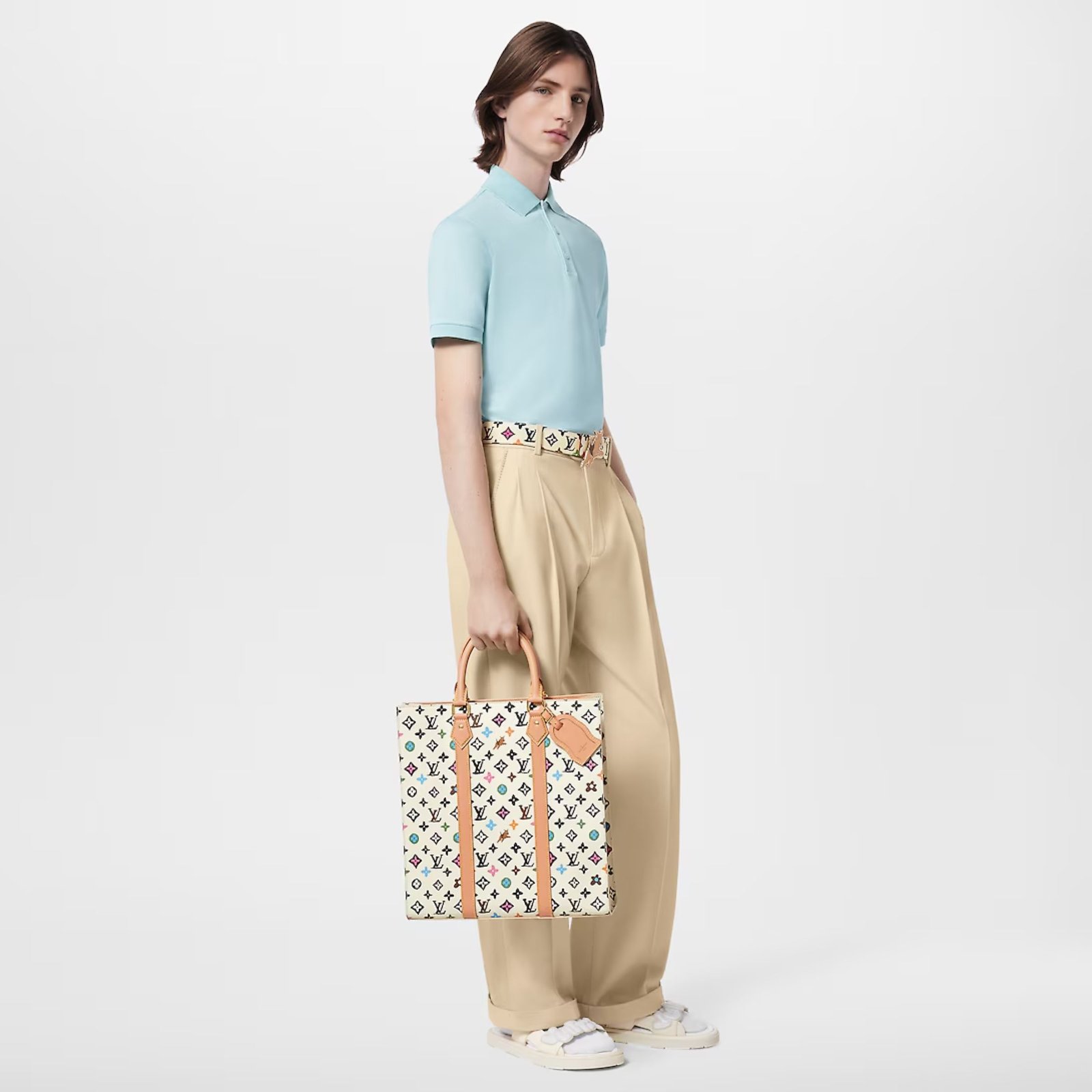 • The Sac Plat carryall takes on a playful feel in Monogram Craggy canvas, a hand-drawn variation of the Monogram, imagined by Tyler, that integrates light-hearted flowers and dogs into the pattern. The trims are, including the wavy name tag. Two top handles and a removable shoulder strap give multiple carry options.