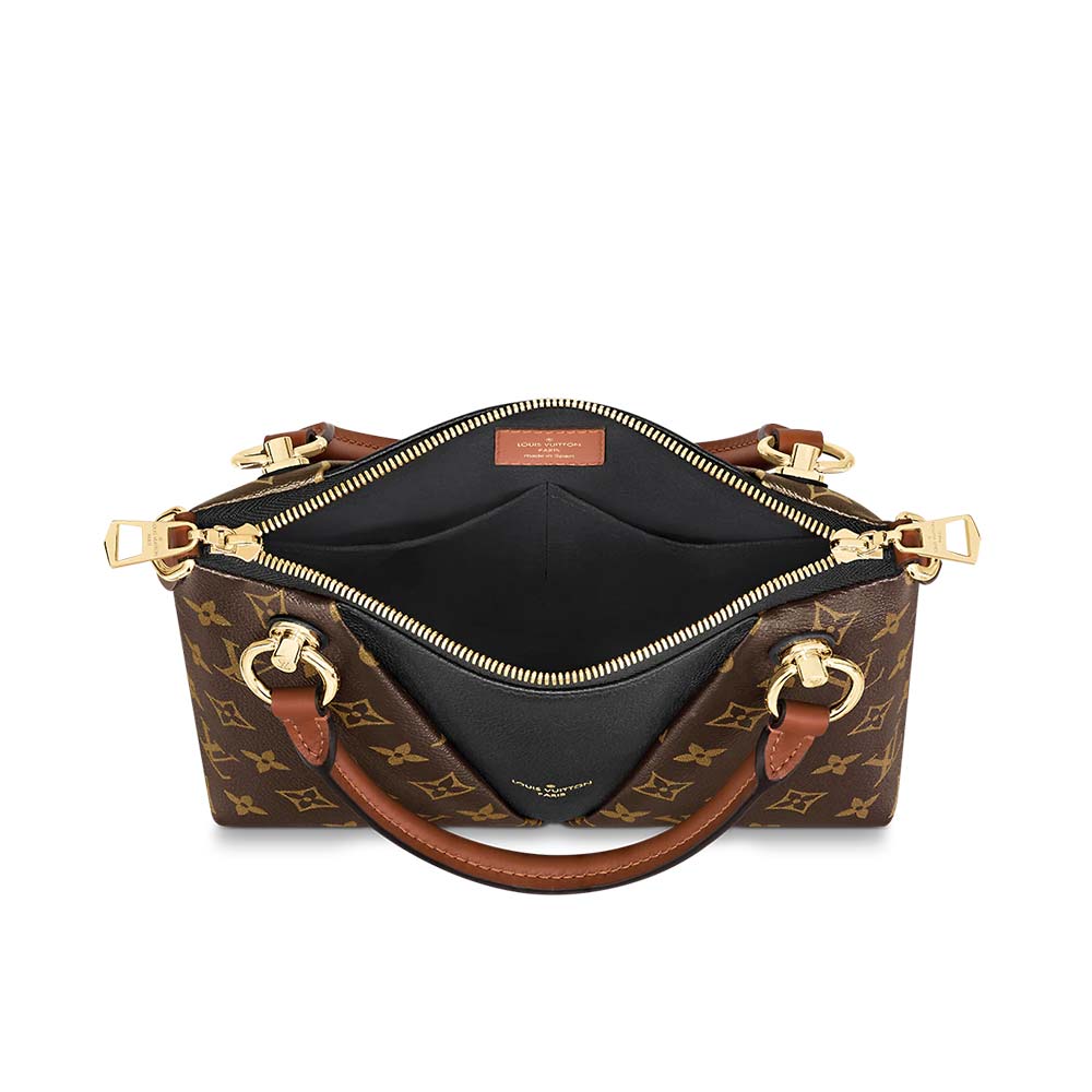 The V Tote BB handbag comes with a detachable strap, allowing it to be carried or worn over the shoulder. The design, which is crafted from Monogram canvas and features a grained leather triangle-shaped panel, references the Vuitton V. Gold-colour embellishments and a leather nametag provide the finishing touches.