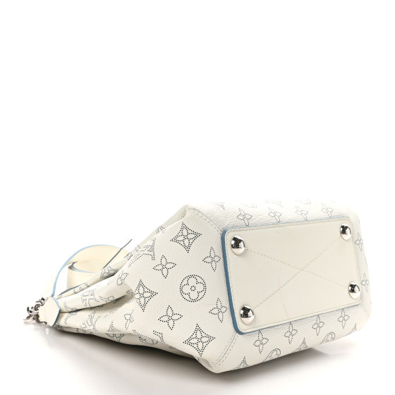 This is an authentic LOUIS VUITTON Mahina Babylone Chain BB in Ivory. This tote is crafted of Louis Vuitton monogram perforated ivory leather. It features a leather-covered chain-link handle, an optional leather shoulder strap, and silver hardware. The zipper top opens to an interior of blue microfiber with zipper and patch pockets.