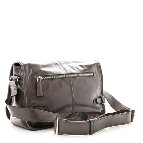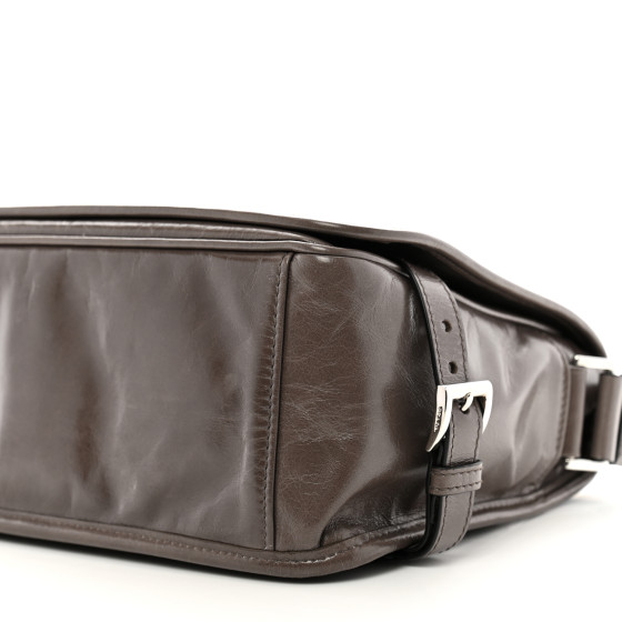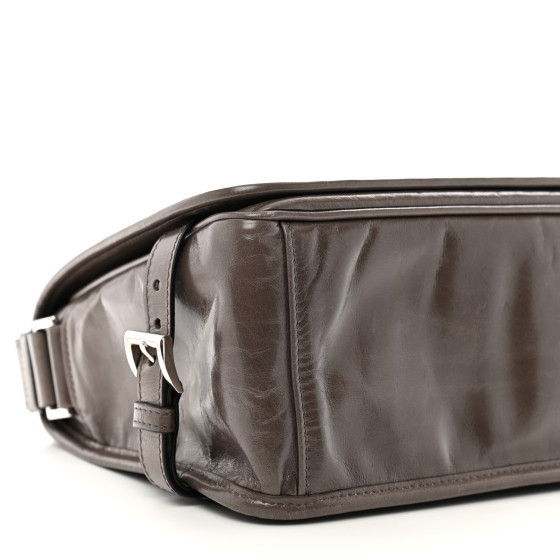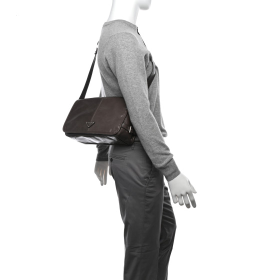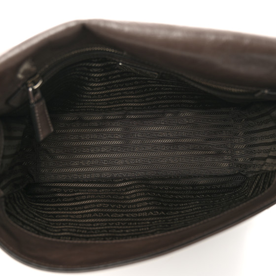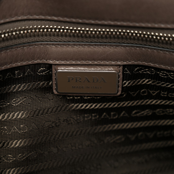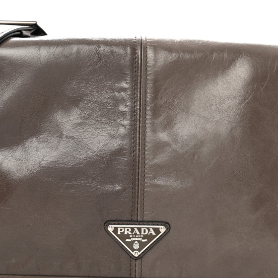 This is an authentic PRADA Soft Lux Triangle Shoulder Bag in Fumo. This stylish tote is crafted of luxuriously textured glossy leather in dark grey. The bag features a leather tstrap, a polished silver Prada logo. The top is open to a matching Prada jacquard monogram interior with a zipper pocket.