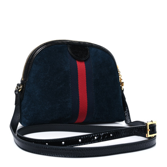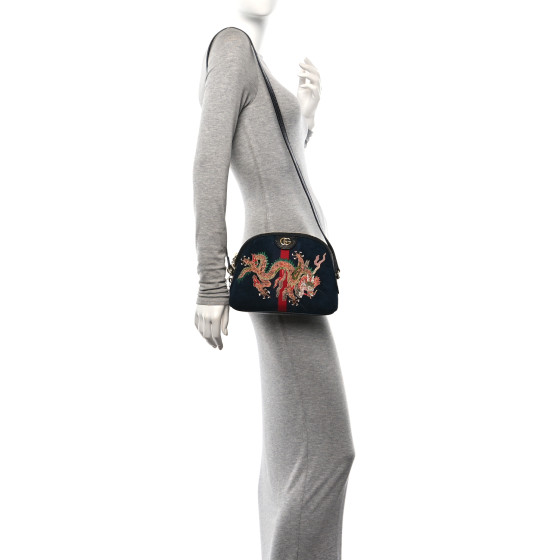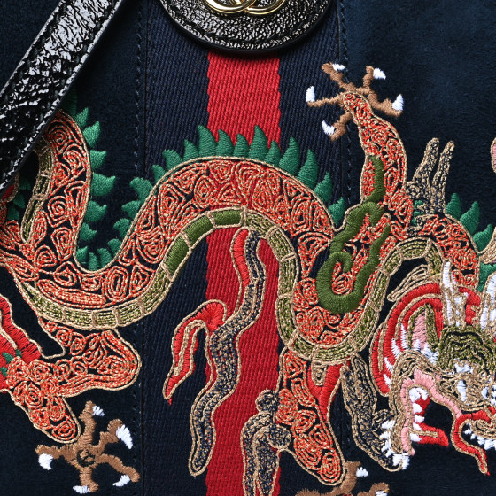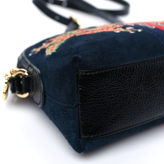 This is an authentic GUCCI Suede Patent Dragon Embroidered Small Ophidia Dome Shoulder Bag in Blue and Multicolor. This shoulder bag is crafted of soft suede leather in navy blue. This bag features eye catching embroidery of a bold dragon, black patent leather accents, blue and red web and a long black patent leather shoulder strap. The top zipper opens to a blue satin interior with patch pockets.