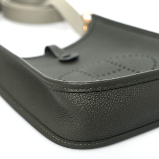 This is an authentic HERMES Taurillon Clemence Amazone Evelyne TPM in Vert Olive and Sauge. This petite crossbody bag is crafted of grained calfskin leather in olive green with a light green canvas crossbody strap. The bag features a perforated Hermes H oval logo on the front and a crossover strap that unsnaps to a green suede interior.