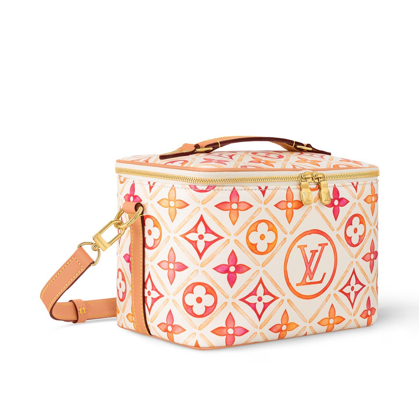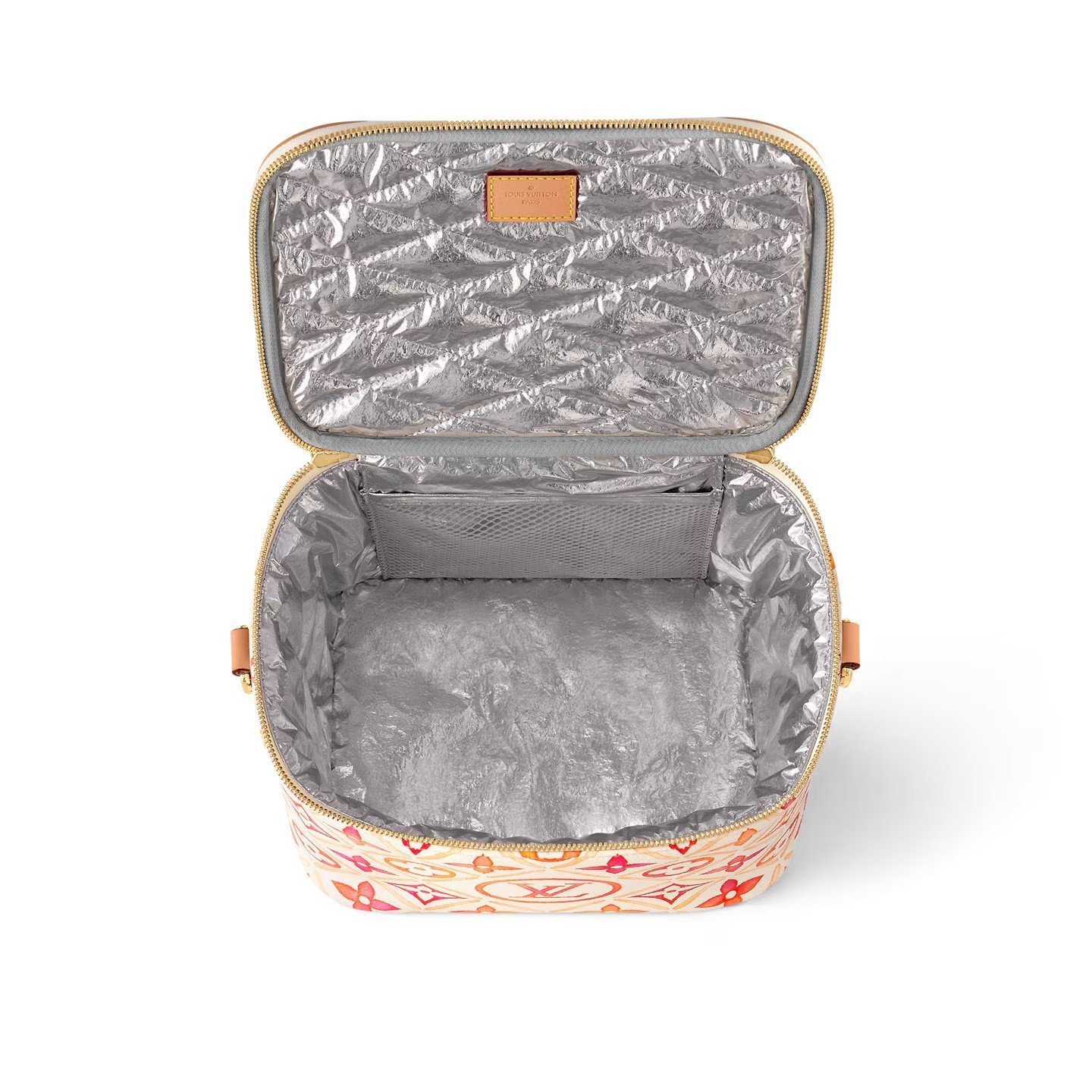 • Picnic in style with the Small Coolbag, which comes in canvas printed in shaded raspberry-pink with the Monogram Flower Tiles motif of the LV By The Pool collection. A top handle and removable, adjustable shoulder strap are practical features, as is the double-zip closure. An isothermal lining ensures food and drink are kept cool and fresh on the go.